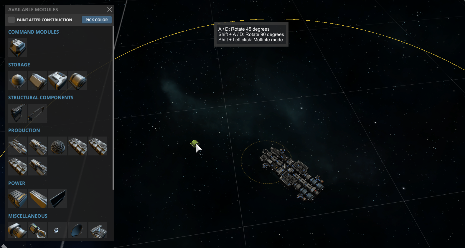 Ship editor: Now you can place modules for construction and use move tool in much larger radius which now displayed with yellow circle. Previous attempts to place modules within a tiny radius of engineering modules was terribly inconvenient and now it is fixed!