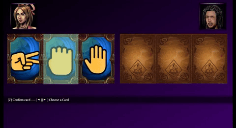 Iron Grid is on its way to being complete. It is our premier mini game and we hope that everyone will enjoy its unique and familiar mechanics. It's a good mix between Suikoden 2 duel system and a strategy card game. Here, we show a bit of that mechanic with the way you decide on who is going to go first. We use this rock-paper-scissors strategy in the main game as a way to add variety, chance, and strategy to the way you play.