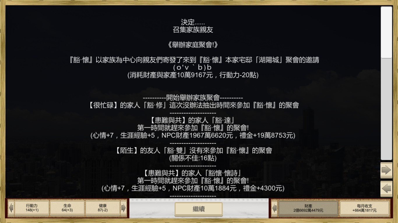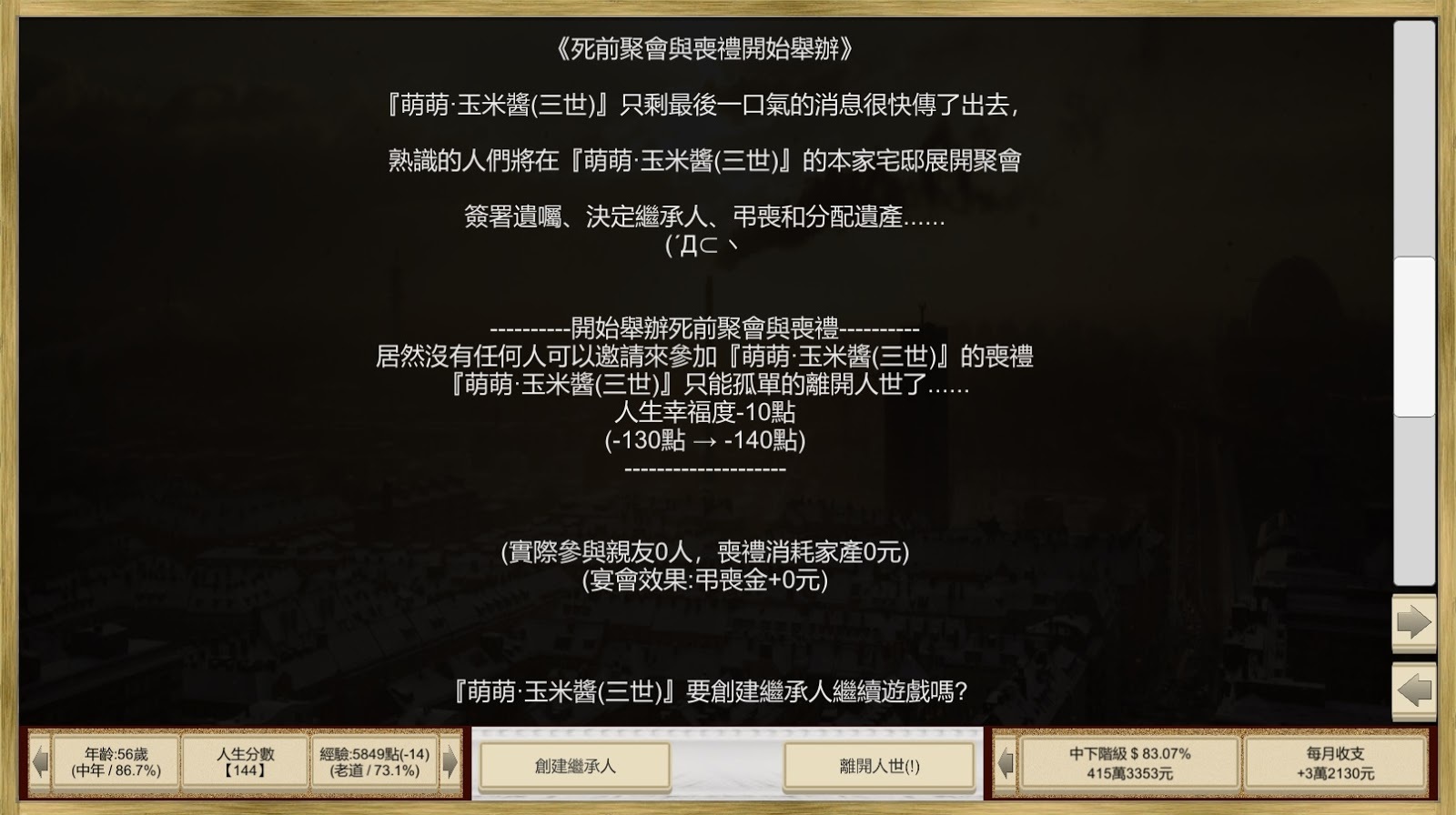 *新增了角色死後可以創建繼承人繼續遊戲的功能。