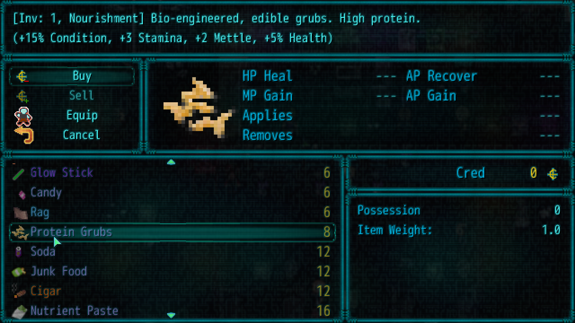Added Protein Grubs consumable item (Bio-engineered, edible grubs. High Protein, low flavor, awful texture. Affordable price.)