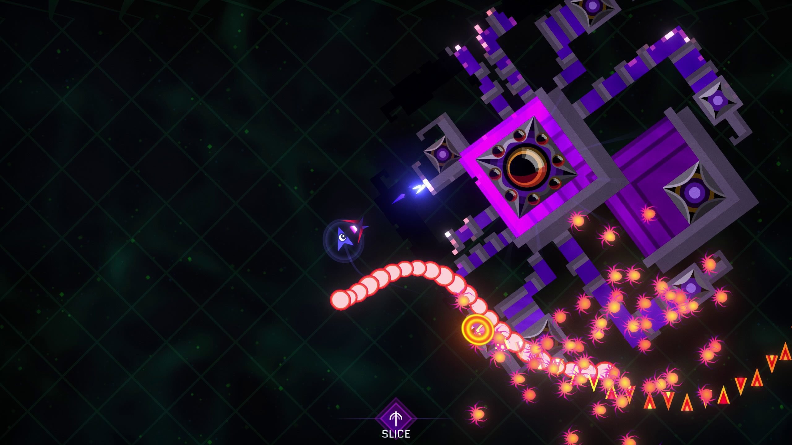 The first version was called Space Usurper, a Unity Web Player game showing off the mechanic of breaking apart bosses made of pixels. While we've moved to a much higher fidelity art style now, you can still see that the basic design of a triangular ship with a rotating gun has persisted since way back then.