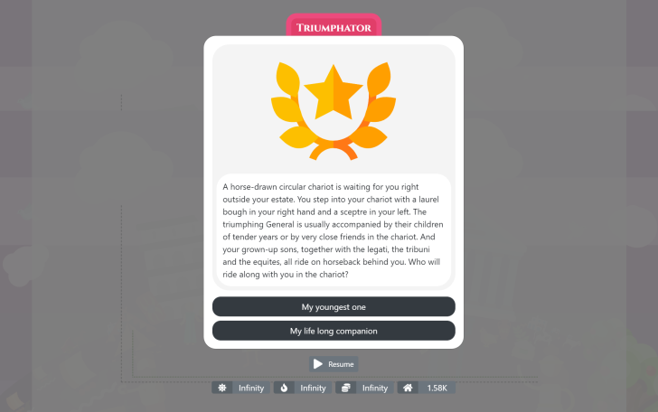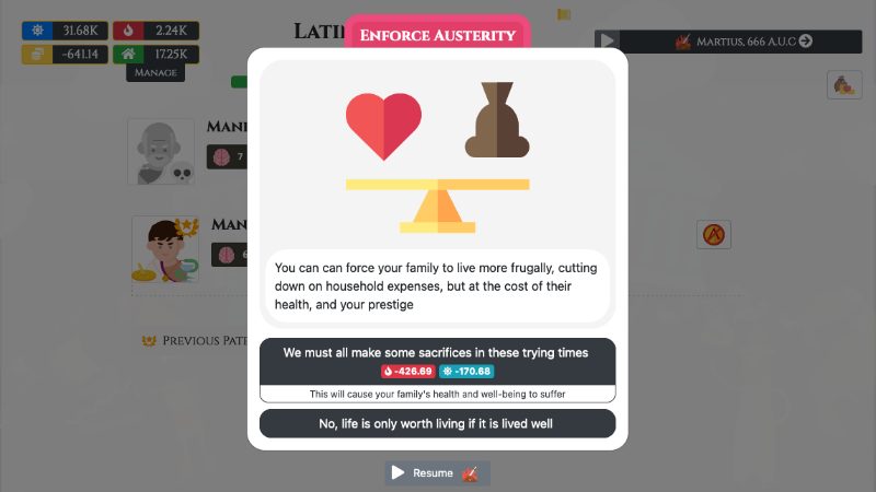 Release v1.4.2 + Significant balance changes + New option to enforce austerity + Choice to nudge child towards a personality similar to your own + Bug fixes & stability improvements, including a major one around warfare events not triggering as expected + A few UI changes