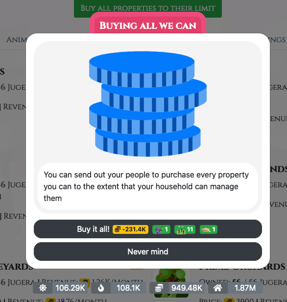 + UI and quality of life improvements including + "Buy all available properties" button when you have enough money + Pause/Resume button and property and cash info in event screens + Tappable character names with info on event screens + And much more + New event chains + Multiple bugfixes