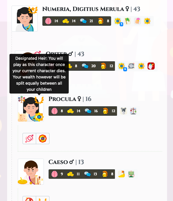 Release v1.5.0 + Support for multiple saved games, with option for manual saving, & support for portable save files + Women are now playable & can be heirs + "Matrilineal" Marriages where the children are adopted into the mother's family + Twins, triplets and more + Caretakers to help manage stewardship of assets when your parrifamilias can't + Several performance, UI & QoL improvements including a buy to limit, autoplay speed & volunteer for conscription buttons + Balance changes around traits, conscription, costs and more + Bugfixes and other tweaks