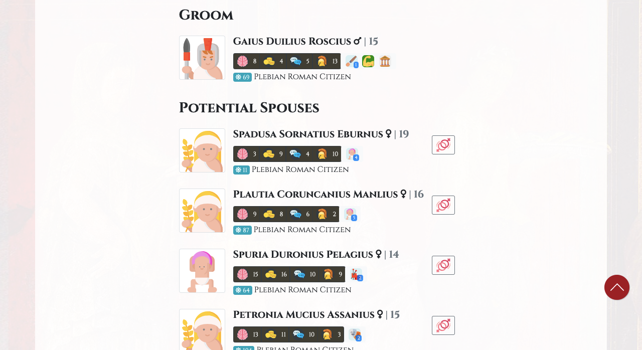 The game is open-ended without a set endgame just like in real life, but a grand goal for any ambitious Roman family was to land a Consulship of the republic. This could be your goal in the game as well, climbing the Cursus Honorum and becoming a "New Man" - "Novus Homo"
