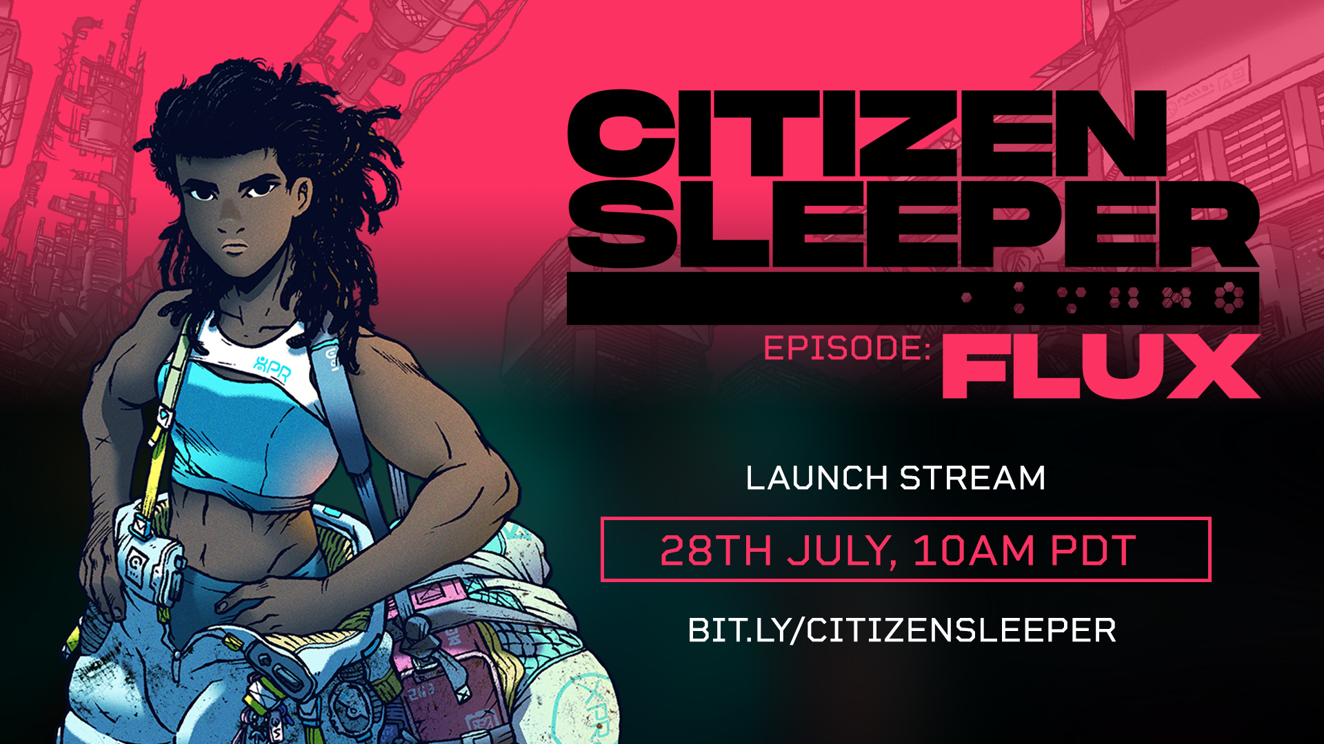 What: Episode: FLUX Launch Day Stream When: Thursday, July 28th. Time: 10am PDT Where: Citizen Sleeper Steam Page
