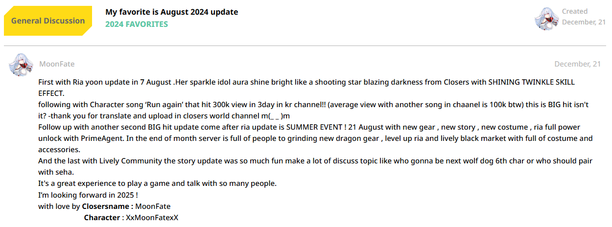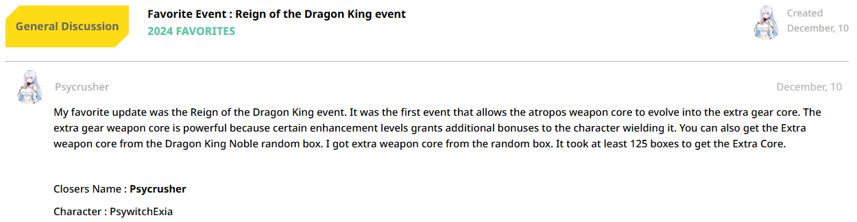 The Agents Favorite 2024 Updates Event has officially concluded! We invited all Agents to share their favorite game or patch updates from the Closers World server in 2024, and the responses were fantastic!