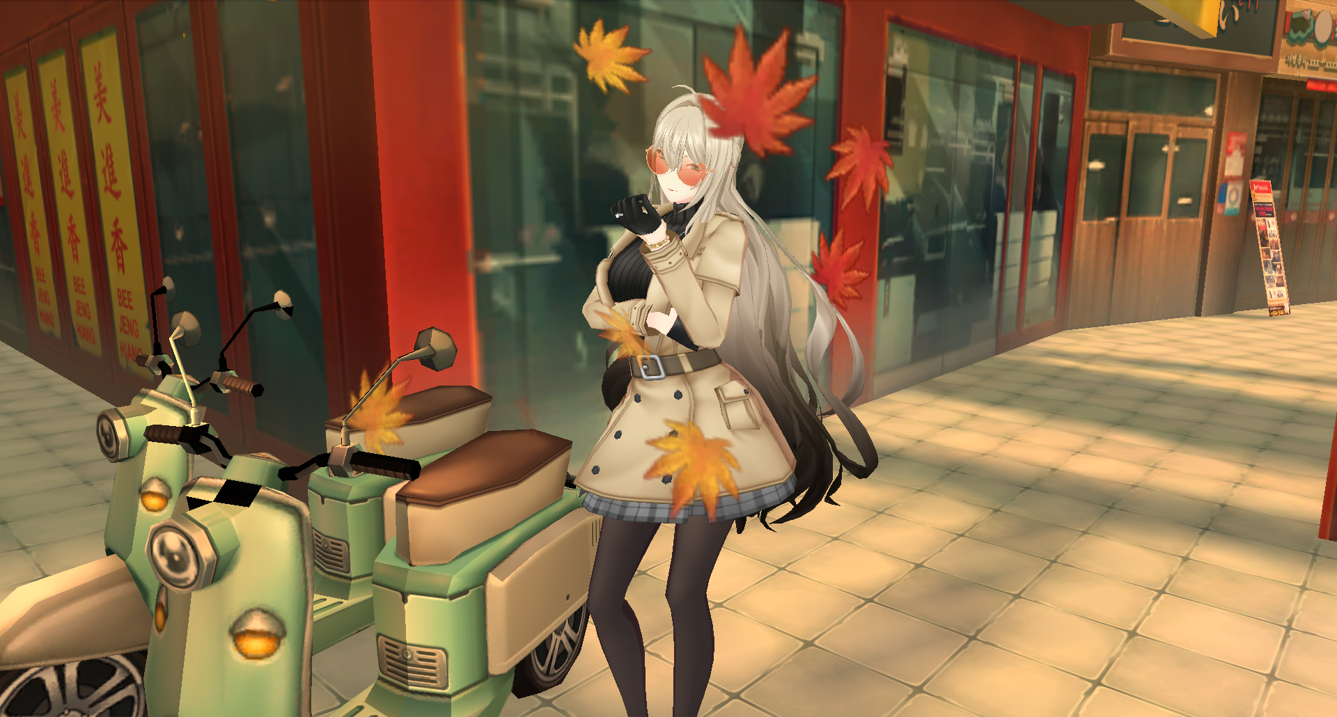 For the occasion, I dressed up my Harpy to match the warm colours of autumn. With the chilly weather creeping in, stocking is a woman's best friend when you want to wear a mini skirt. I added orange sunglasses to give her a stylish look as well. Lastly, I picked this background because its ambiance perfectly matches the autumn vibe!