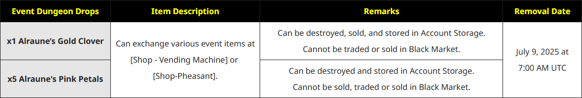 [/td][/tr][tr][td] ● New and returning players who clear the "Mandrake Busters!" Dungeon will receive a guaranteed additional drop. ● Can be destroyed and stored in the account bank but cannot be sold, traded, or listed on the Black Market. ● Removal date: December 31, 2025 at 9:00 AM UTC [/td][/tr][/table]