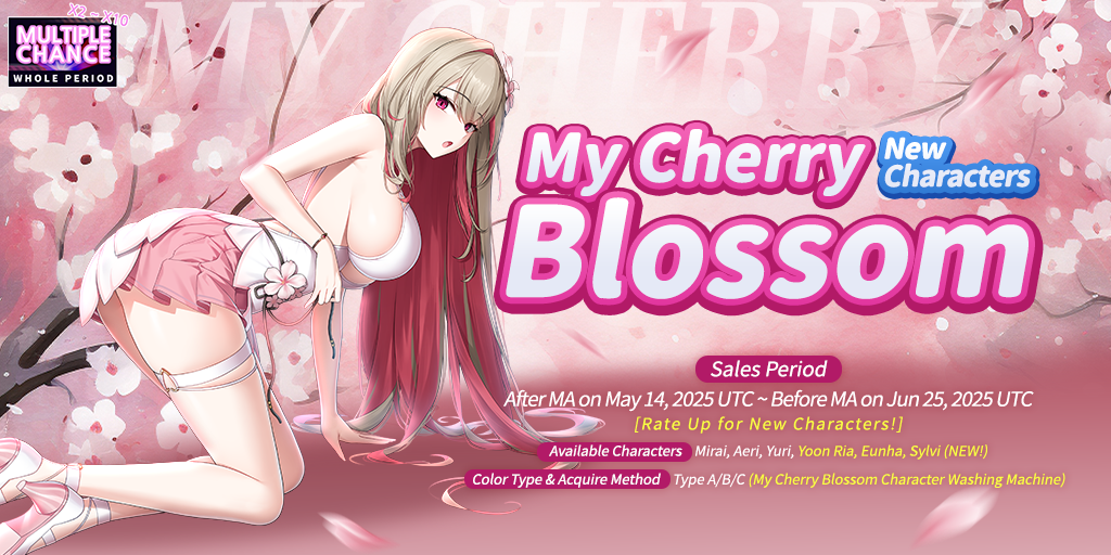 [table][tr][th] [color=#FFE135]Purchase Count[/color] [/th][th] [color=#FFE135]Bonus Item[/color] [/th][/tr][tr][td] 35 [/td][td] x2 My Cherry Blossom My character Piece Selectable Box (Accessory and Phase Wings not included) [/td][/tr][tr][td] 70 [/td][td] x2 My Cherry Blossom My character Piece Selectable Box (Accessory and Phase Wings not included) [/td][/tr][tr][td] 100 [/td][td] x3 My Cherry Blossom My character Piece Selectable Box (Accessory and Phase Wings not included) [/td][/tr][tr][td] 150 [/td][td] x1 My Cherry Blossom Hair Pin [/td][/tr][tr][td] 200 [/td][td] x1 My Cherry Blossom Normal Full Set Selectable Box [/td][/tr][tr][td] 250 [/td][td] x1 Unique Accessory Selectable Box [/td][/tr][tr][td] 300 [/td][td] x1 My Cherry Blossom Normal Full Set Selectable Box [/td][/tr][tr][td] 350 [/td][td] x1 My Cherry Blossom Phase Wings [/td][/tr][tr][td] 450 [/td][td] x1 My Cherry Blossom Special Full Set Selectable Box [/td][/tr][/table]