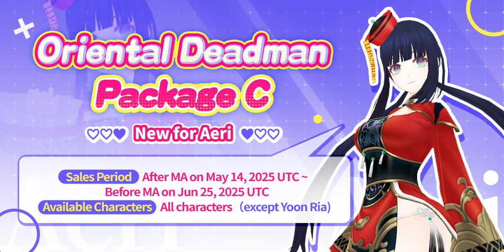 [table][tr][th] [color=#FFE135]2-star Oriental Deadman Premium Package (C Type)[/color] [/th][/tr][tr][td] Oriental Deadman Hair - Type C Oriental Deadman Chest - Type C Oriental Deadman Legs - Type C Oriental Deadman Feet - Type C Oriental Deadman Hands - Type C Oriental Deadman Hat - Type C [/td][/tr][tr][td] Time-limited Sale Price: [color=#c3a3ff]1,990 N-coins[/color] Purchase Restriction: None [/td][/tr][/table]