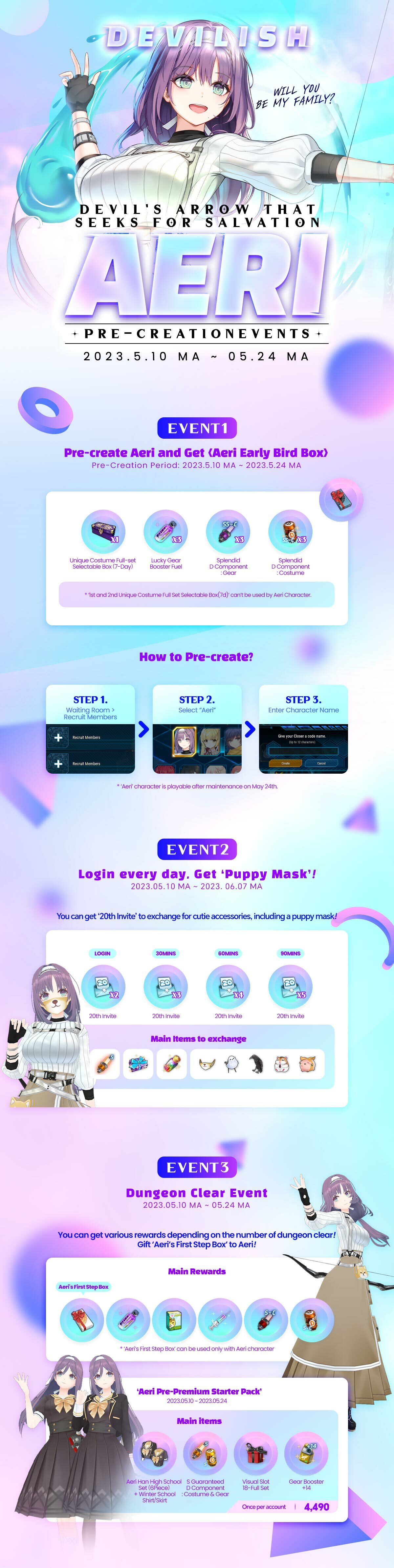 [table][tr][td]All Characters - Accumulative Login Event[/td][/tr][tr][td][table][tr][td]Aeri Early Bird Box[/td][/tr][tr][td]x3 Lucky Gear Boost I x3 Splendid D Component: Gear x3 Splendid D Component: Costume x1 Unique Costume Full Set Selectable Box (7days)*[/td][/tr][/table][/td][/tr][/table]