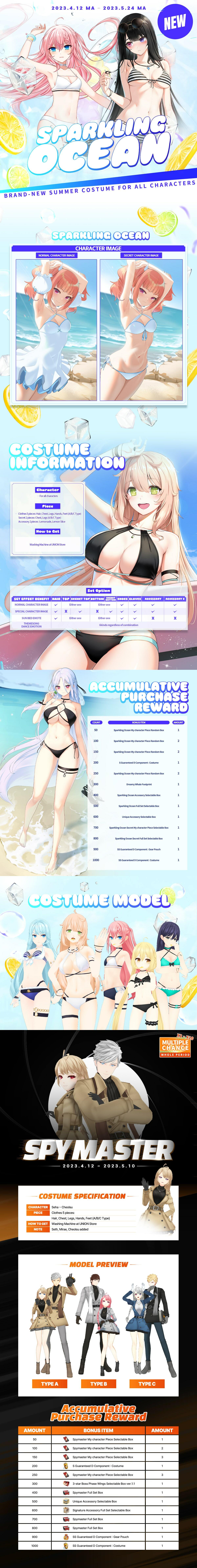[table][tr][td]Full Set Box Component[/td][/tr][tr][td] Spymaster Hair ABC Spymaster Chest ABC Spymaster Legs ABC Spymaster Feet ABC Spymaster Hands ABC[/td][/tr][/table] Washing Machine Accumulative Purchase Reward [table][tr][td]Amount[/td][td]Bonus Item[/td][/tr][tr][td]30[/td][td]x1 Spymaster My Character Piece Selectable Box (Select 1 from My Character Pieces)[/td][/tr][tr][td]70[/td][td]x2 Spymaster My Character Piece Selectable Box (Select 1 from My Character Pieces)[/td][/tr][tr][td]120[/td][td]x3 Spymaster My Character Piece Selectable Box (Select 1 from My Character Pieces)[/td][/tr][tr][td]180[/td][td]x1 S Guaranteed D Component: Costume[/td][/tr][tr][td]240[/td][td]x3 Spymaster My Character Piece Selectable Box (Select 1 from My Character Pieces)[/td][/tr][tr][td]300[/td][td]x1 3-Star Boss Phase Wings Selectable Box ver.1.1[/td][/tr][tr][td]400[/td][td]x1 Spymaster Full Set Box[/td][/tr][tr][td]500[/td][td]x1 Unique Accessory Selectable Box[/td][/tr][tr][td]600[/td][td]x1 Signature Accessory Full Set Selectable Box[/td][/tr][tr][td]700[/td][td]x1 Spymaster Full Set Box[/td][/tr][tr][td]800[/td][td]x1 Spymaster Full Set Box[/td][/tr][tr][td]900[/td][td]x1 SS Guaranteed D Component: Gear Pouch[/td][/tr][tr][td]1,000[/td][td]x1 SS Guaranteed D Component: Costume[/td][/tr][/table]
