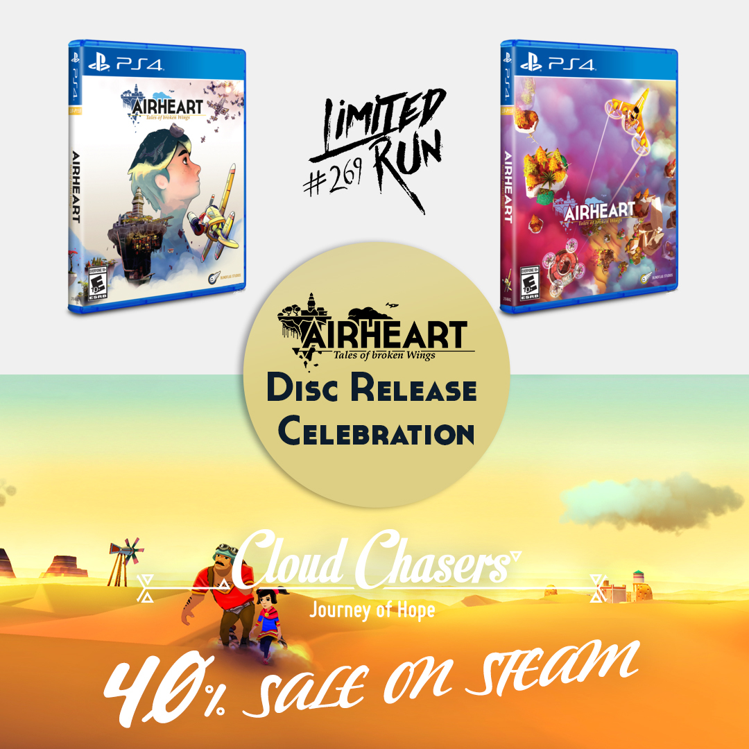 It's something we always dreamed of, and today it will happen: our first physical release! AIRHEART, the sequel to Cloud Chasers, will get a disc version for PlayStation 4, published by Limited Run Games. Make sure to check out the LRG store[www.limitedrungames.com] today to order your copy, it's limited to 1500 prints!