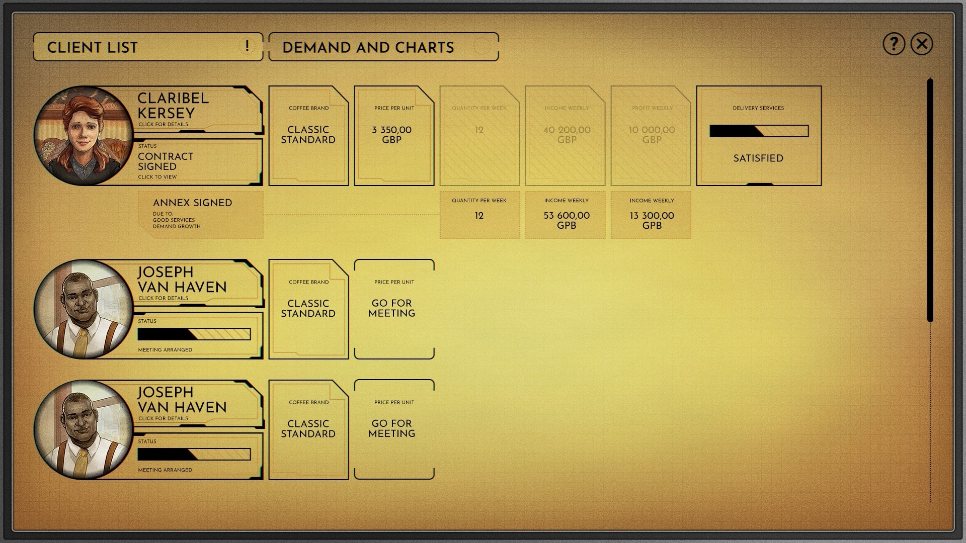 Here the player can see avaliable clients, with which they signed a contract or they can schedule a business meeting to estabilish cooperation. We wanted to remove boring tables and breathe new life into the UI by presenting the player's results in an interesting retro-futuristic form.
