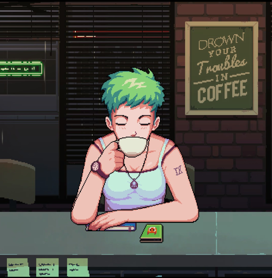 The main selling points of the game would be its story, its pixel art with 90s anime-inspired graphics, and its lo-fi chill-hop tunes that became so popular suddenly on YouTube that year. There was no title for the game yet, so we called it Project Green Tea Latte. During the two week game jam, prototypes were made, art was drawn, teams were changed, and in the end we had four prototypes. You can check out all of them here. After the game jam, the studio decided to work on two games at once, and one of them is Project Green Tea Latte.