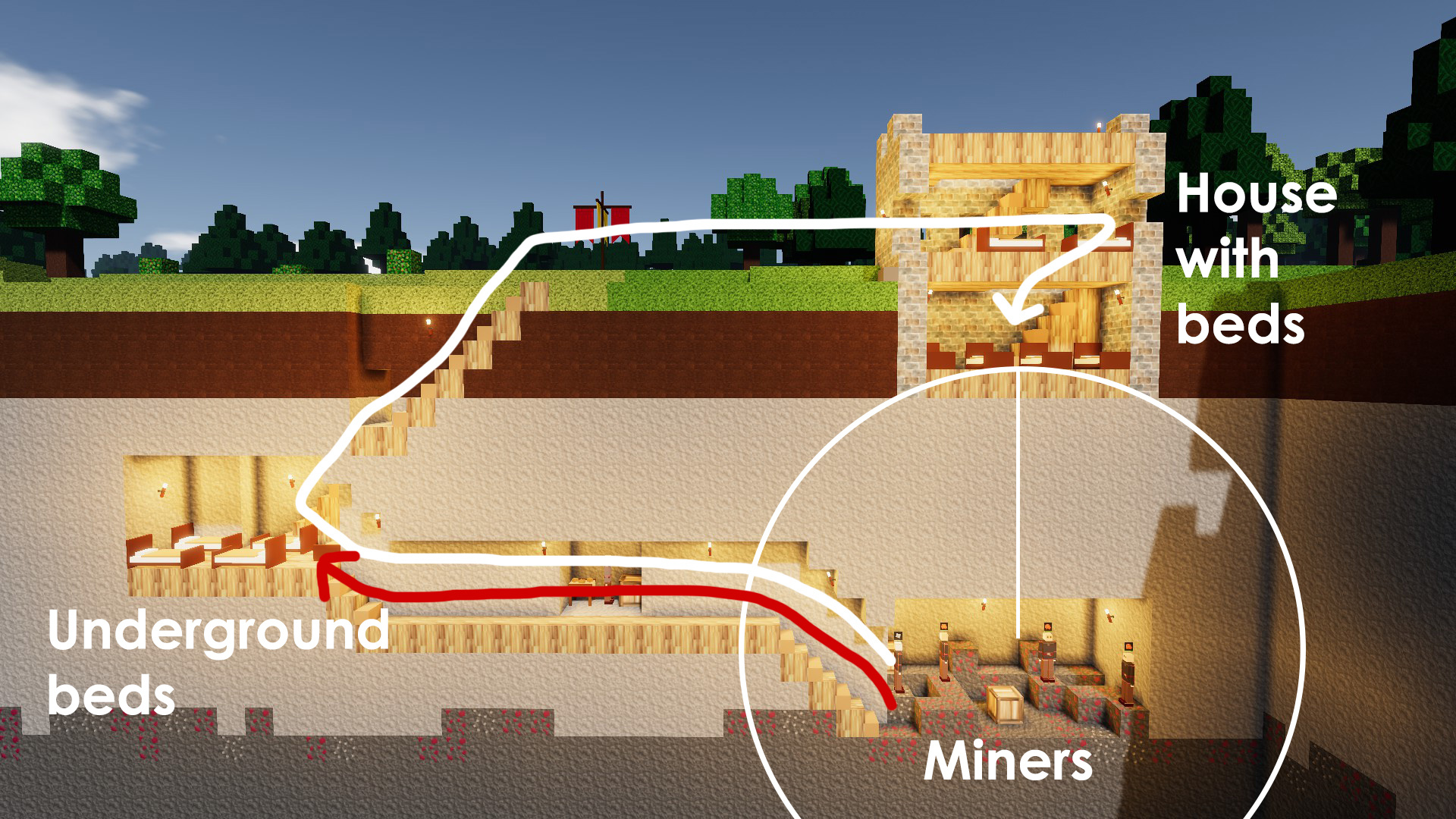 This is visualized in the image above. The miners will need a bed during the night. They search for the closest bed, ignoring terrain, and find the beds in the house above them. Within that circle, there are no closer beds. Then they calculate a path, which is a pretty long one. That path takes them through another underground room filled with beds. They’ll ignore those and go to the “closest” beds.