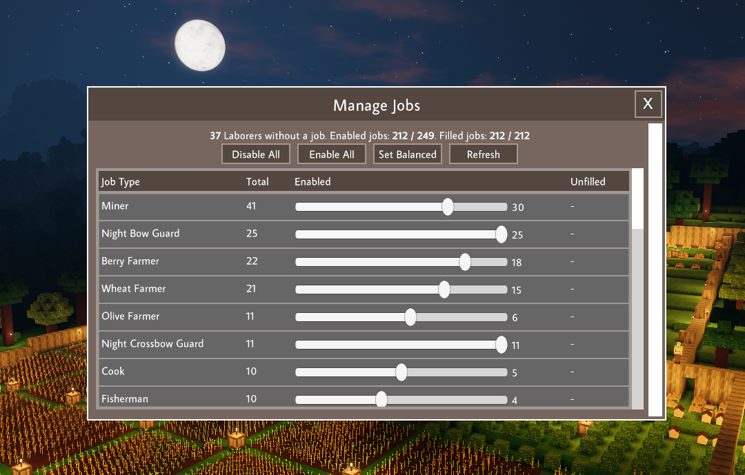 We're planning to add sliders to this menu that allow players to manually reduce the amount of 'open job slots' per job type. Imagine you've got 8 flax farmers and a surplus of flax: you could decide to temporarily 'fire' 4 flax farmers, assigning them to different jobs, while the rest keeps working.