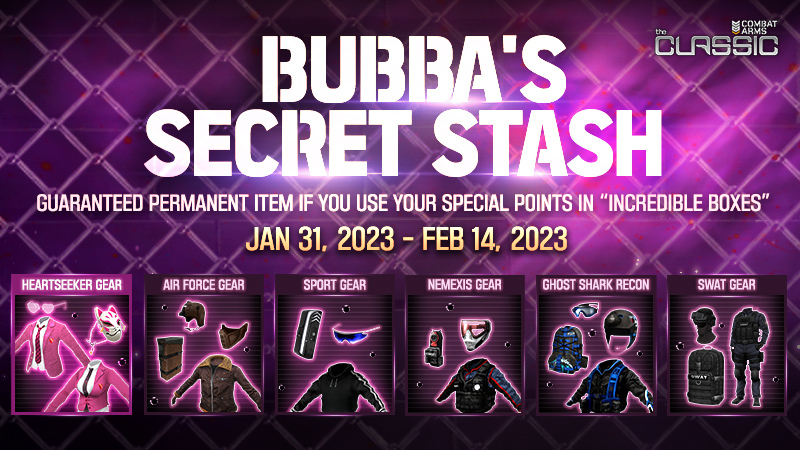 Updated February 2023 Daily Jobs - Earn various weapons and gear set with the updated daily job rewards Updated February 2023 Wheel of Fate rewards - Added new Feature “Skip”button Updated February 2023 Combat Dice rewards Updated February 2023 Rollcall rewards Updated February 2023 EXP/GP boost Updated February 2023 Survival Pass rewards - Get the EXCLUSIVE “AZAZEL HEARTSEEKER(PERM)” in VIP Survival pass Updated Updated February 2023 5-Shot - Get the RETROPOP & WILD REBEL package (7days) and more ITEM in 5-shot now! Updated Bubba's Secret Stash - Guaranteed Permanent ITEM when using special points in “Incredible Boxes”