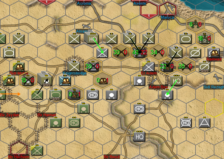 1. Hexes now highlight after combats/barrages/air attacks, and keep a running tally of total casualties, per side, in that hex during the turn.