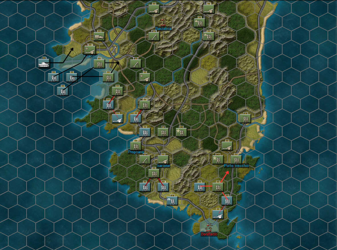 Sardinia: An idyllic Mediterranean tourist destination, and also incidentally a fantastic battlefield. Sardinia features rugged mountain bastions, light forests, and sweeping open plains. Some sectors of the island present serious challenges to mechanized movement, but almost every hill-top fortress can be bypassed and isolated with proper planning. Corsica: A mountainous and densely forested island that boasts many choke-points to entrap reckless adversaries. Corsica favors infantry combat and places even more importance on controlling the air than other maps.