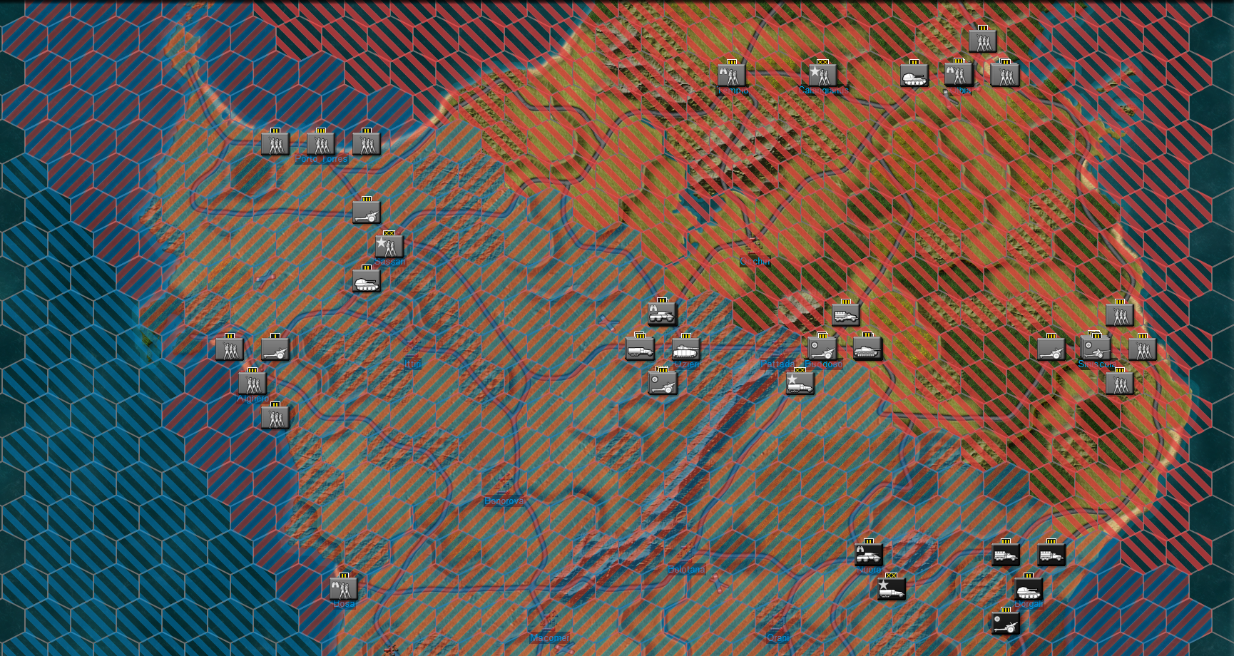 The new air overlay visualizes the aerial battlefield. Airspace control is color coded by faction. In the example above red-highlighted hexes are Redfor airspace and blue-highlighted hexes are Blufor airspace. Hexes that are hash marked both red and blue are areas of contested air space wherein neither side enjoys superiority.