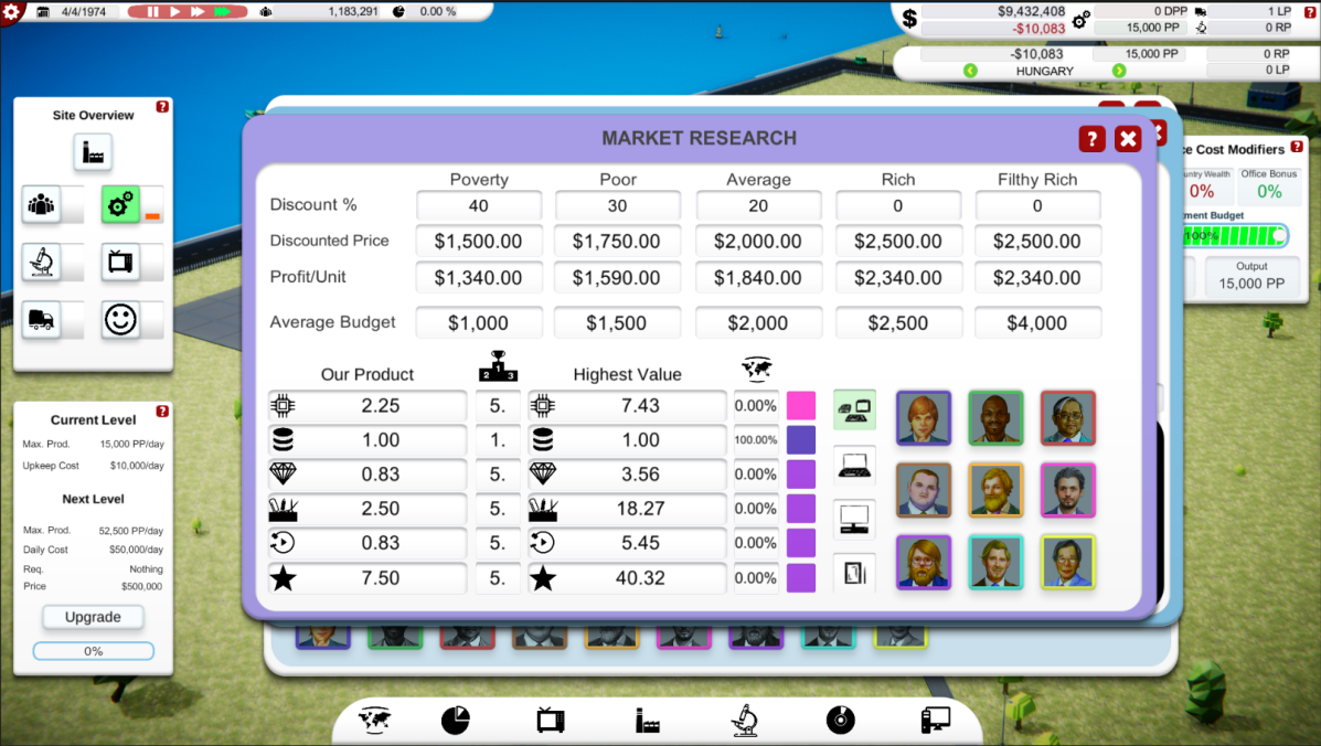 And... that how many of this product was sold in a country with poverty, poor, average, etc... wealth level. As you could see, from now on you can see the average budget of people in the given economy-level per product type. This and other opponents' prices are your indicators now to select your price. In general, you can make much more profit by selling to rich people. But if you sell only to those then you skip the biggest chunks of the market... So these indicators can help you to actually see that who are buying the given product on the given price you've just defined.