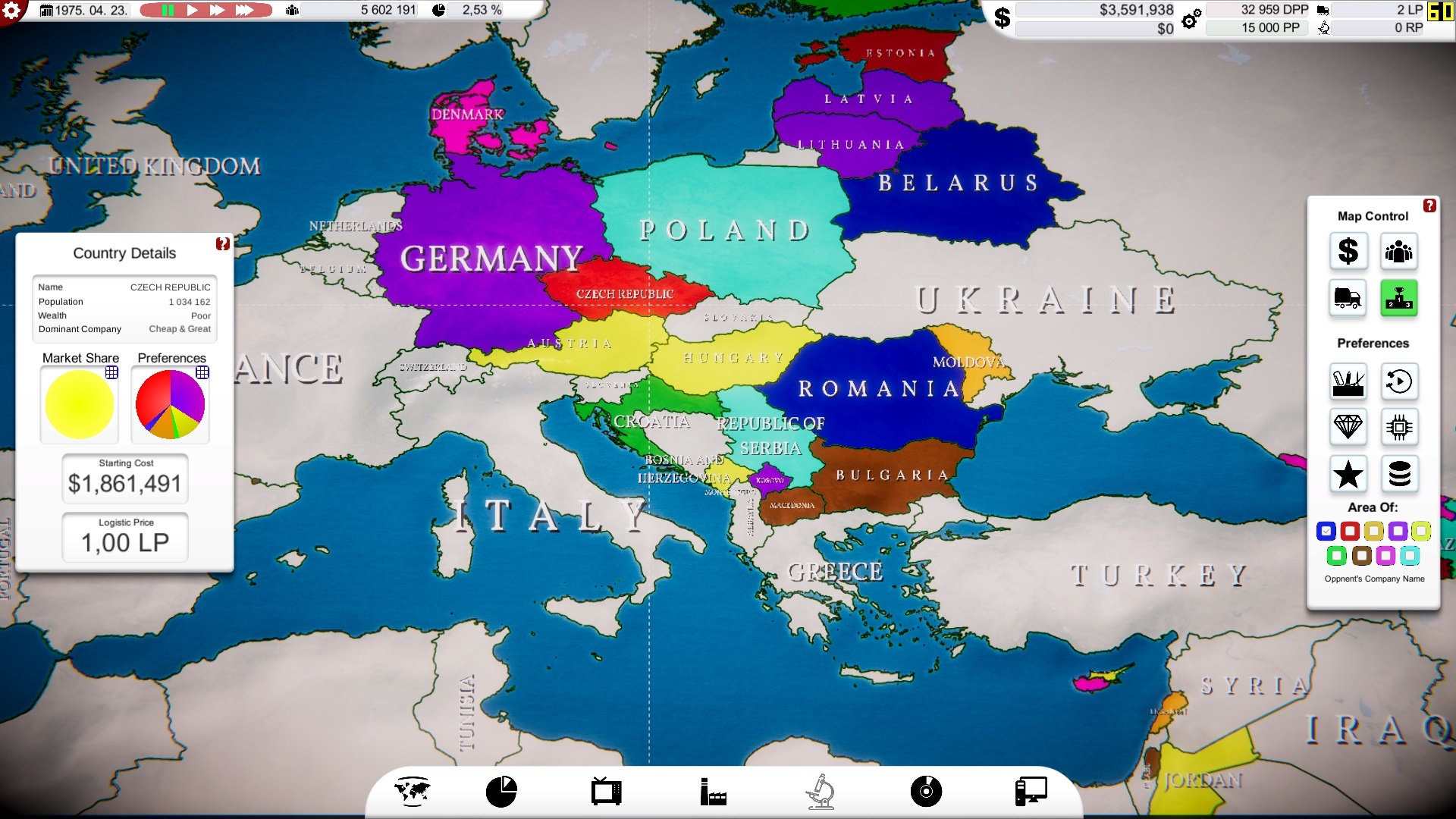 While being able to sell hardware doesn't seem to be a big deal, it is the opposite: it is a lot of work to implement it and it changes many things. As an example still, I haven't decided if it means that I should put hardware sell data on the country detail view such as I do with computer sales. Or maybe I should handle computers with hardware together in that diagram? But computers are more expensive, and on that diagram, you should focus on the strength of your opponents, or shouldn't you focus on that?