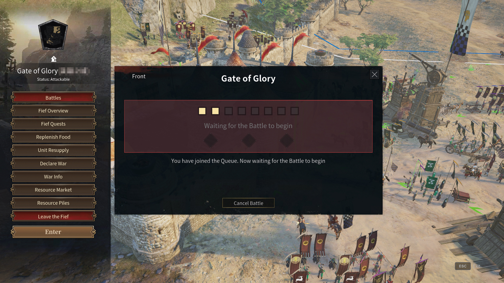 During the territory war, when interacting with the fief in open world to open a front, the attacking side needs to have a queue of players that meets the fief's requirement for front to open. If the attacking side does not meet the required number of players to open the front, all participating attacking players will enter the siege queue and wait for the front to open.