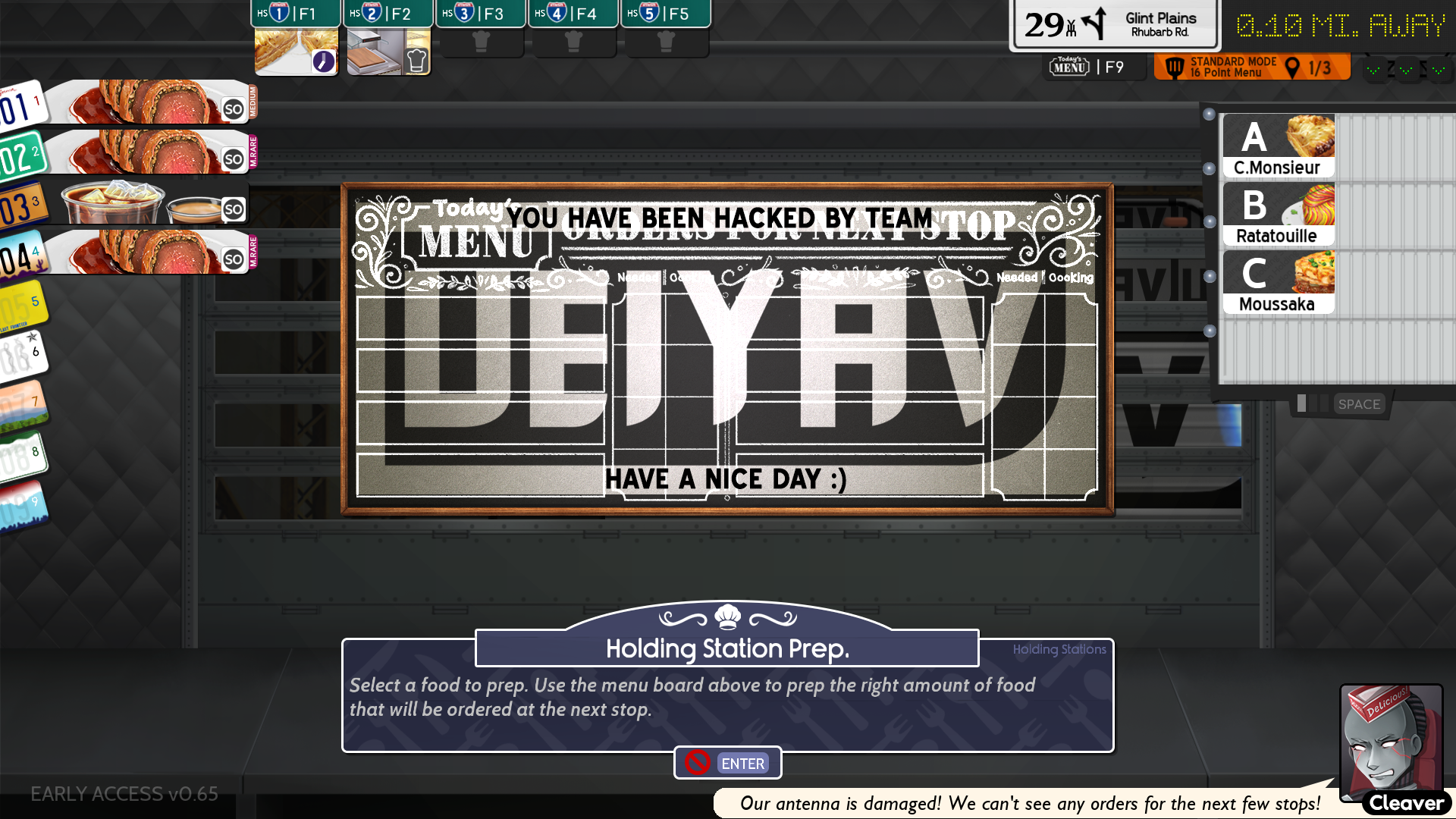 * GLINT PLAINS TERRITORY: 26 new levels await in Texas! Good luck Chef! * PS REQUIRED: Certain days now have PS requirements! You must turn on a specific number of Prep Stations in order to start the day. * UEIYAV FOOD TRUCK SIGHTED: Brutal new hack attacks are spreading across Glint Plains thanks to the UEIYAV food truck! * Four new achievements!
