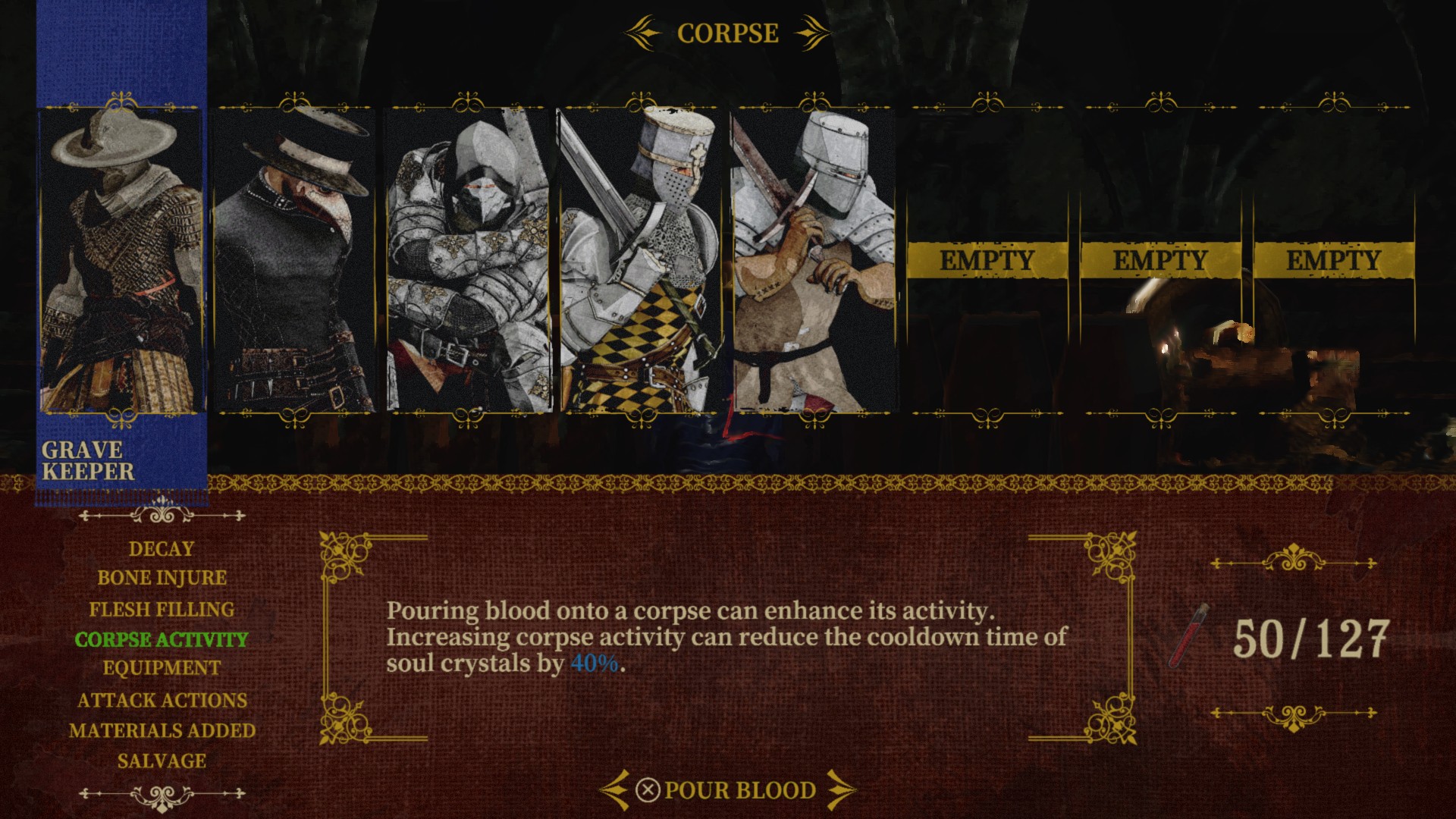 When the total amount of Blood poured into the Blood Altar reaches a certain threshold, the "Corpse Activity" option will be added to the Ossuary - Coffin - Corpse Management Interface. You can pour in Blood to reduce the cooldown time for the selected character's Soul Crystal usage. The effect of Physical Activation is similar to preservatives and lasts for the duration of each exploration.