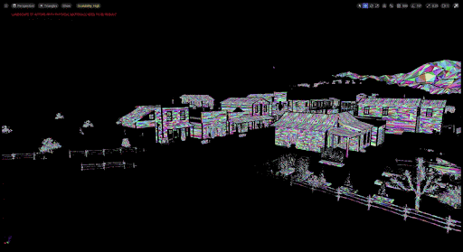 Nanite triangle visualisation of the main street in our town, Bravestand. Anything black is not nanite – the colorful ones are. You can see how the triangles change when you get closer.