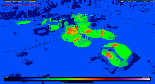 Visualisation of lighting of a scene, in this case the town of Bravestand from a different angle. The orange blobs signify overlaps of light coming from different light sources, which is more costly performance-wise.