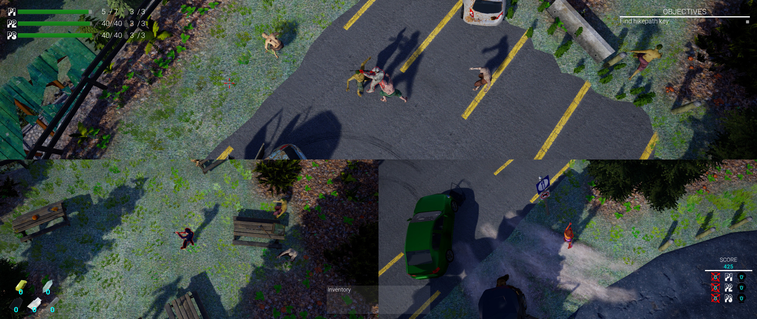 At launch C.Q.C. – Close Quarters Combat provides a variety of maps divided in four settings: forest, desert, city and island. Each setting has its own co-op and PvP map. The co-op maps are quite large and you have to complete objectives in order to get to the next sector and to finally beat a boss on each map to escape the zombie infested area. The PvP maps are smaller and are designed to have a fun competitive experience for up to four players. In each map you are able to choose your player from six different unique characters and equip them from a selection of four different weapons. In PvP mode you are able to select, dependent on your character, a special skill which grants you an advantage during gameplay for a short period of time. The skills reach from a higher fire rate over increased speed to a health boost. The co-op mode comes also with a special feature: here you are able to get materials from beaten bosses and zombies with which you can upgrade your weapon stats like the fire rate or reload time. Higher weapon levels come also with a different look like various weapon camos and different weapon attachments. Once your guns are upgraded you are able to master higher difficulties where you gain better materials to improve the weapons even further. This leads to a numerous replayability of the co-op maps.