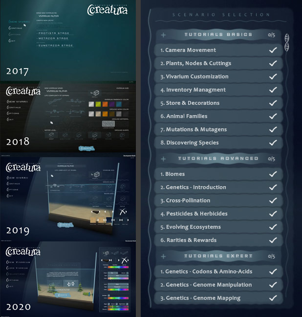 Hello folks! Over years of work on Creatura, it has evolved from basic, almost clicker/mobile game, into complex DNA and evolution simulation, spanning multiple gameplay mechanics. Even year ago, with only couple animals swimming around in our tanks, progression system was oriented towards unlocking new plant mutations. Sight of first leafs or flowers was a massive achievement for players, often requiring hours of gameplay. Mainly as a side effect of missing animals content.