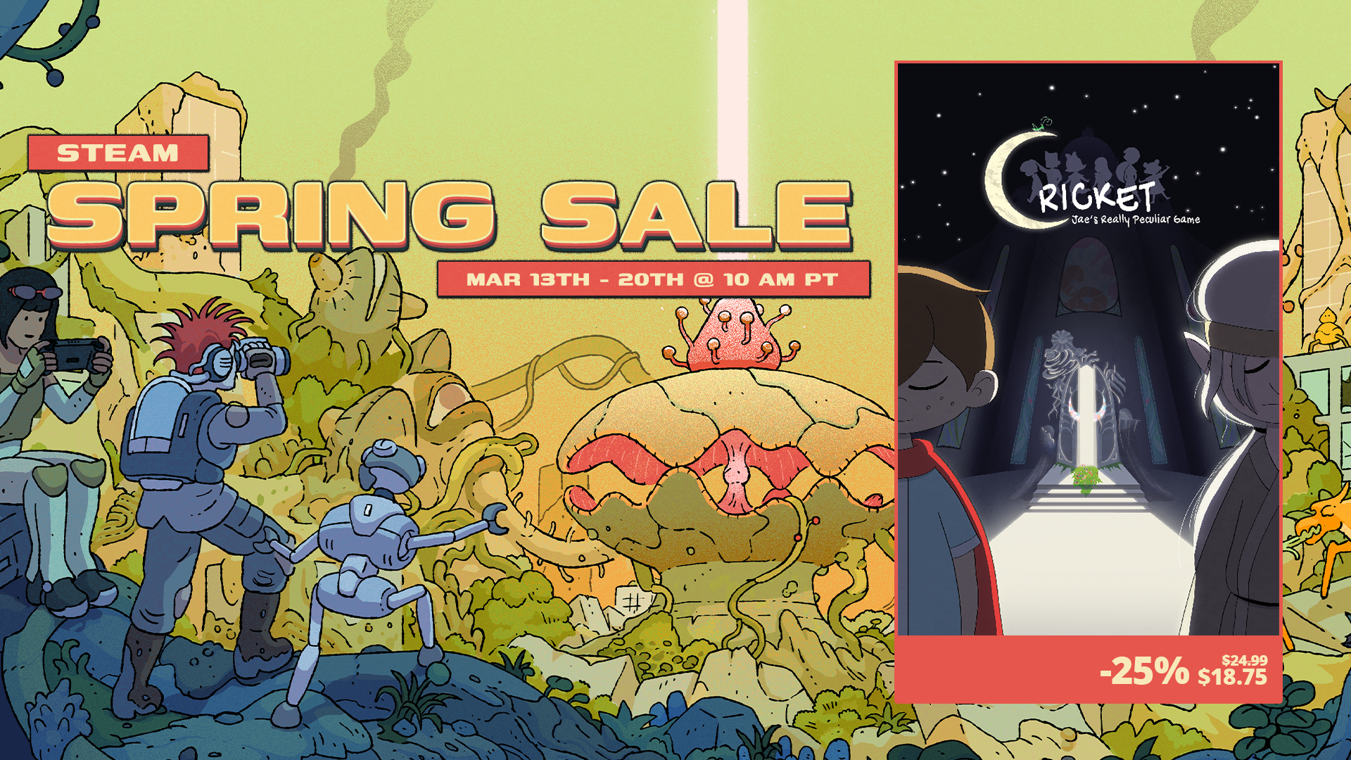 Just popping in really quick to say that Cricket: Jae's Really Peculiar Game is 25% OFF during the Steam Spring Sale! The OST is also on sale for 20% off!