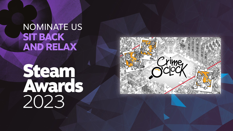 It's that time of the year: The Steam Awards 2023 nominations are live! If you liked playing Crime O'Clock this year (awe hope you did!), why not considering supporting our team by voting for us in the "Sit Back & Relax" category? It never has been that good to be a chilling detective!