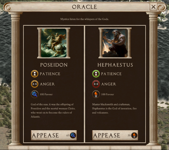 To solve this, the new "God UI" shows various indicators that the player's soothsayers and mystics have divined about the gods. The information is purposely ambiguous and mysterious, and the hope is that players will have fun figuring out the god's intent and behaviour from this.