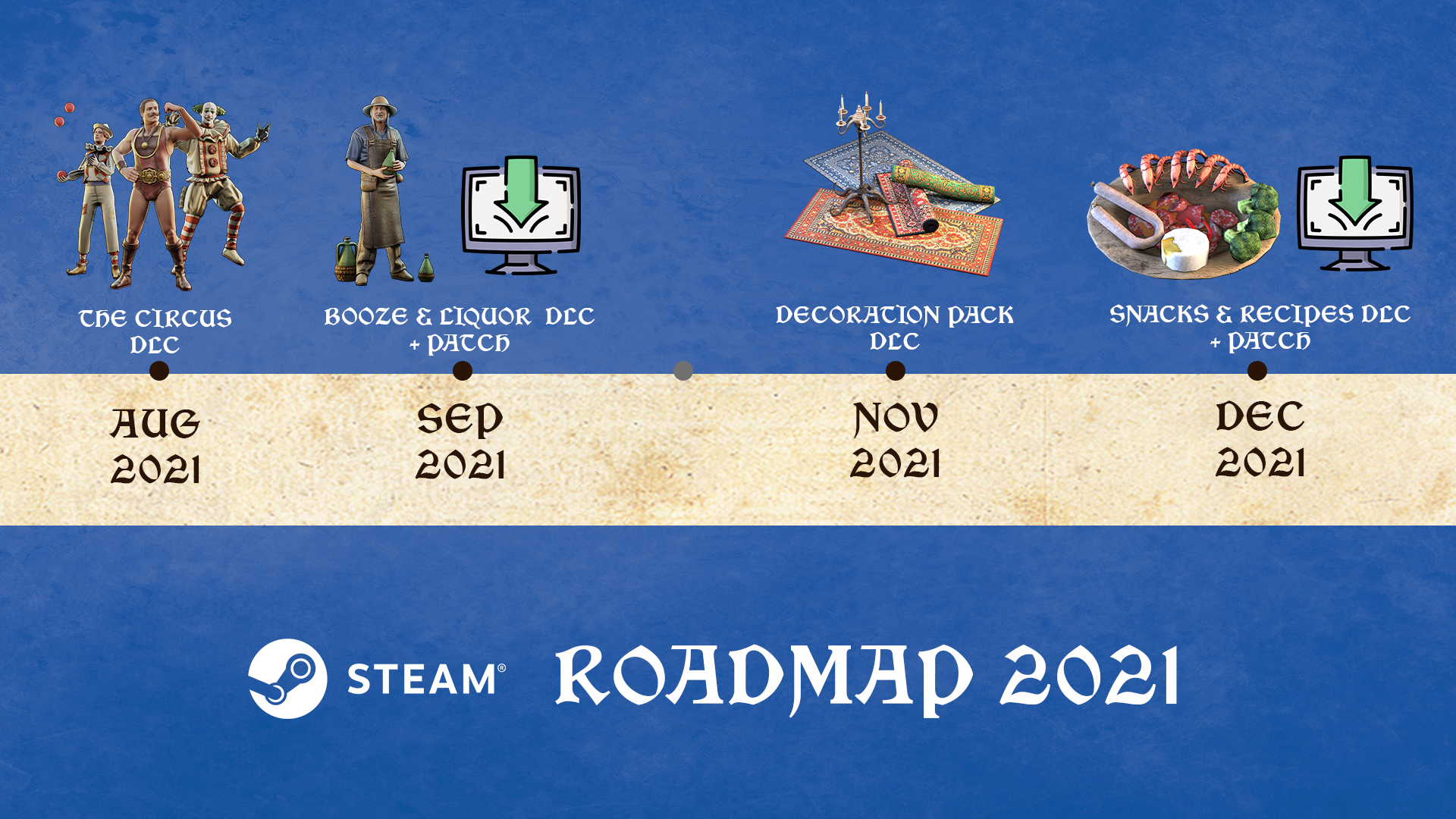 Primarily it was said that the Season Pass DLCs were supposed to be of different origin. Yet to be more sound and consistent, the first two additional packages will be inspired by Klabater’s upcoming games: The Amazing American Circus and Moonshine Inc.! For the Pass owners, the promised premium content awaits, including new characters, a decoration pack, and 100 new recipes (3 of which created by players during the Court Herald Celebration contest).