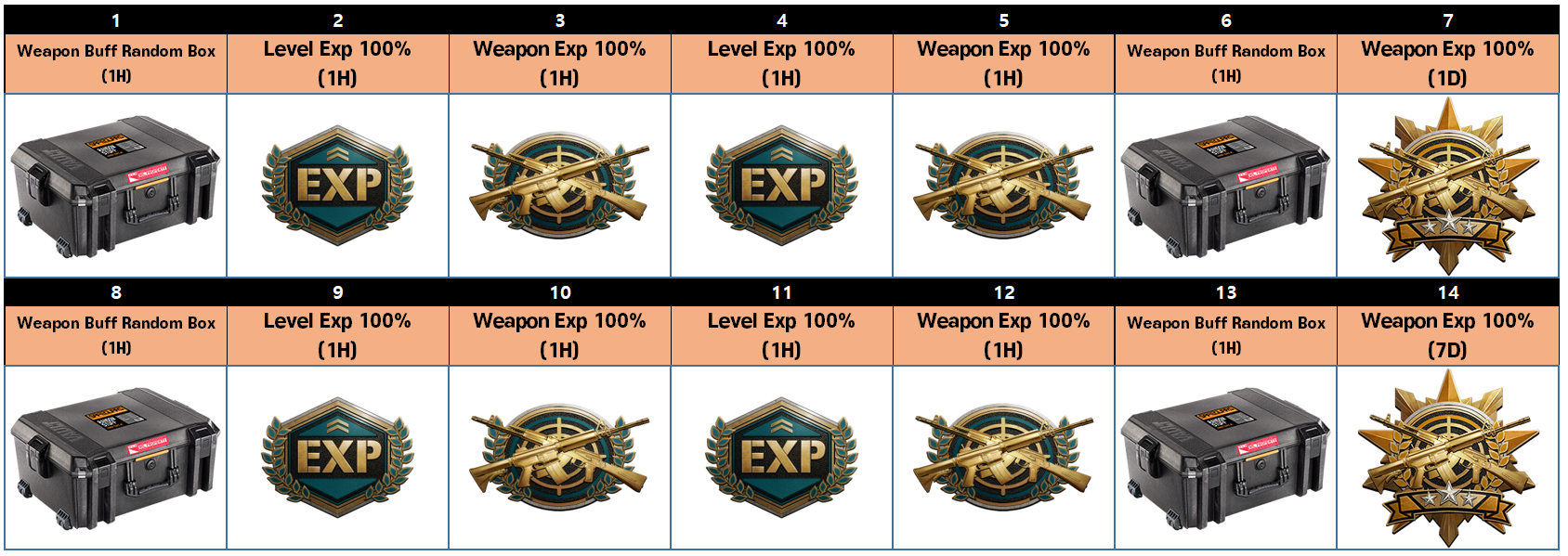 ✔ Event Buff Information - First week of July (July 2 - 3): Level Exp 50% boost - Second week of July (July 9 - 10): Weapon Exp 50% boost - Third week of July (July 16 - 17): Level Exp 50% boost - Fourth week of July (July 23 - 24): Weapon Exp 50% boost - Fifth week of July (July 30 - 31): Level Exp 50% boost