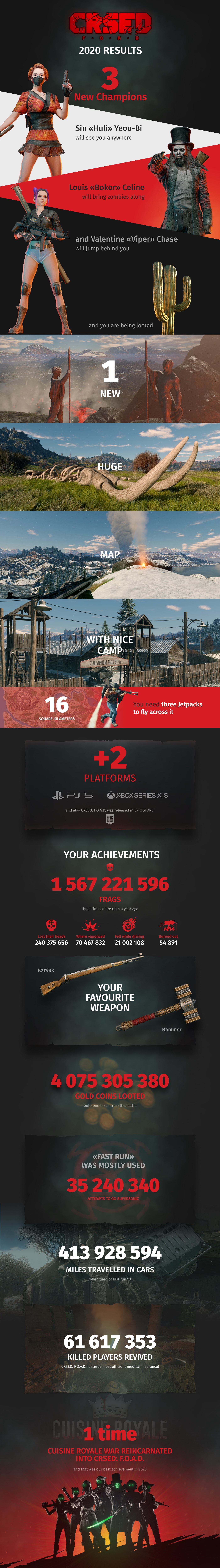 All the 2020 the world of CRSED: F.O.A.D. was expanding to new places and with new champions to make better ritual games. We have monitored your progress and now are ready to share some statistics. Behold!