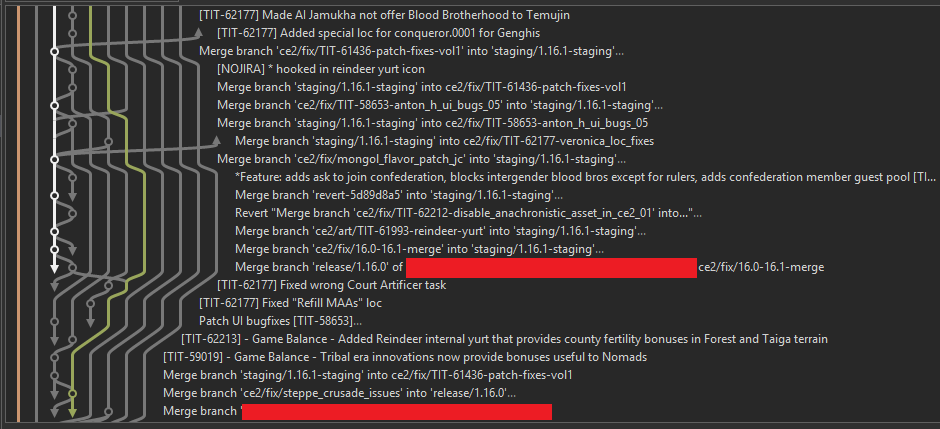[It’s a bit messy to look at, but you can see here how certain commits by the development team are sent to different branches depending on their contents. We have a lot of internal development branches.]