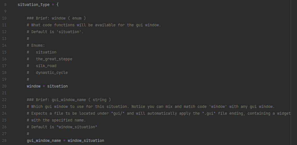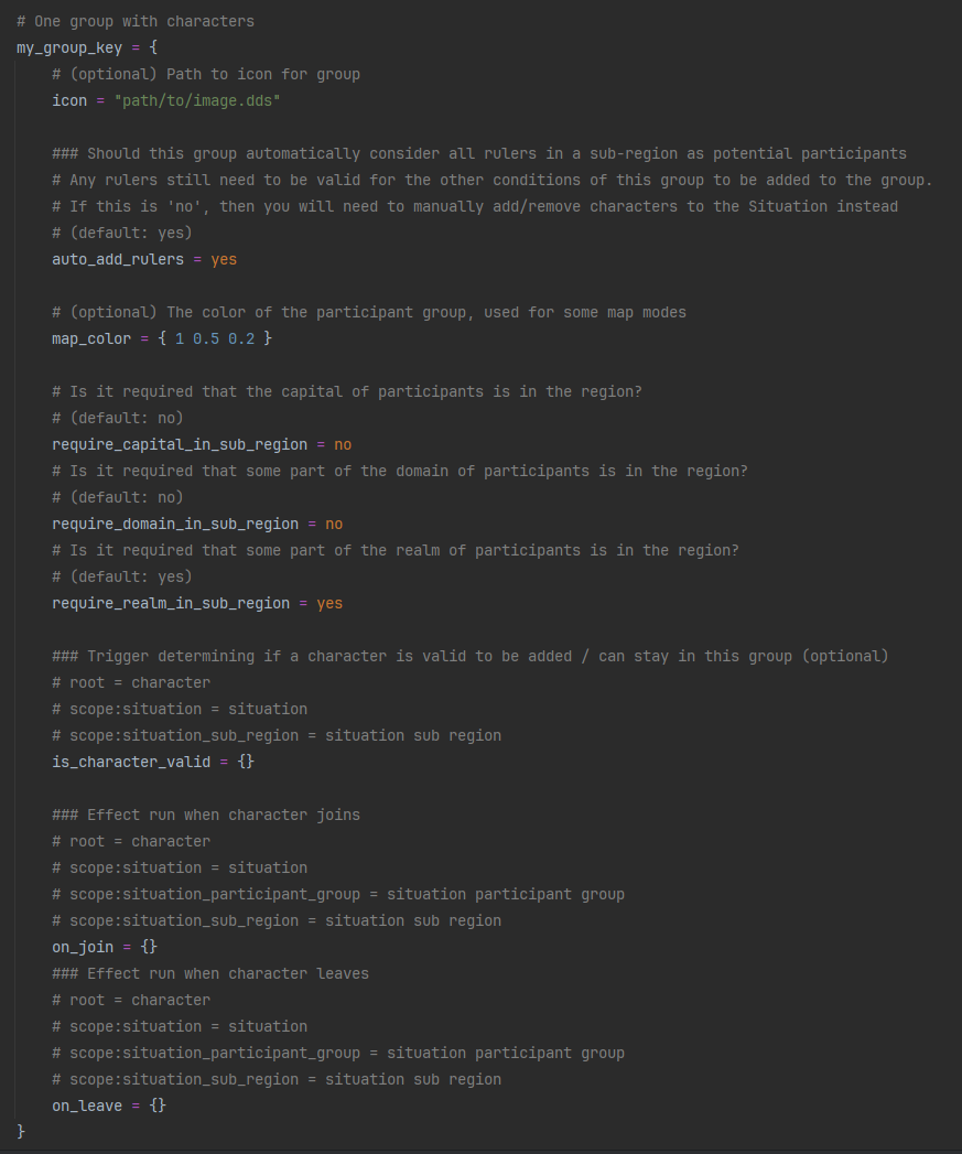 Of course a situation phase definition also contains modifiers and parameters that will apply to the region (county_modifiers), or the characters participating in the situation (character_modifiers), filtered by their Participant Group, which segues nicely into…