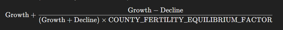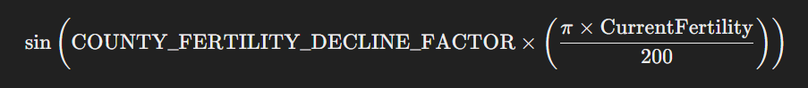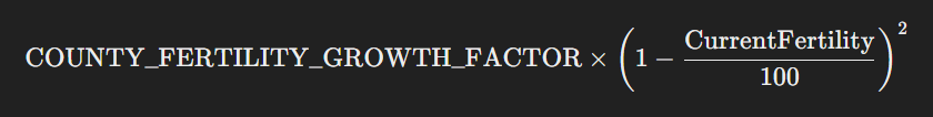 It is important to note that the math behind all this is largely contained in what we’ve called “Current County Fertility Modifier” in the monthly change breakdown. This number is the result of these calculations and what directs the Fertility in a County to trend toward its Equilibrium point.