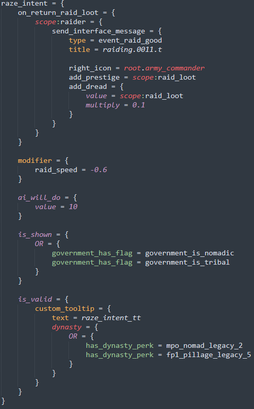 We also use the “on_raid_action_completion” on-action to have different effects happen after each successful raid on a holding depending on the active raid intent of the raiding army. You can check a scoped army’s raid intent using “raid_intent = NAME_OF_INTENT” trigger.