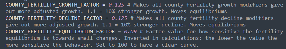 For anyone that hasn’t taken a math class recently, this may all seem like gobbledygook, so here’s the main takeaway for modders: The central way to affect how County Fertility grows and declines, and where it will hit Equilibrium, is by adjusting the following defines which hook into the functions above: