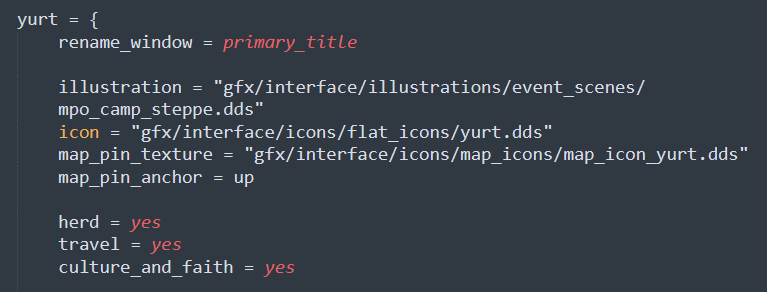 As you can see from the documentation file above, we’re using this system in both Khans of the Steppe, as well as All Under Heaven. It is part of the base game, and thus available for all modders regardless of DLC ownership.