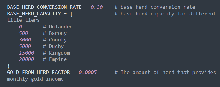 [Defines affecting Herd Capacity, Herd Conversion, and Monthly Gold Income from Herd]