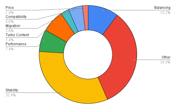 Once everything has been neatly categorized (a task I find immensely soothing, for the record), I can generate a quick chart showing which complaints are dominating the conversation. The main cause of stability complaints in the reviews were already addressed or being investigated, so we can skip that category and take a look at the next one in the list: Balancing.