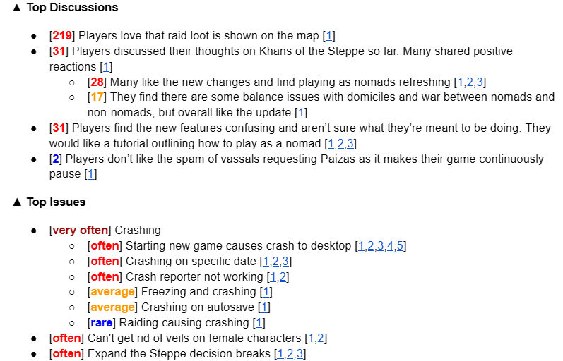 They condense hundreds of discussion threads, suggestions, and reports into a more digestible format to quickly identify what the community finds most pressing. As you can see above, crashing was the most prevalent issue highlighted in the Day 1 report, while balance issues weren’t widely reported until after the Day 1 report period.